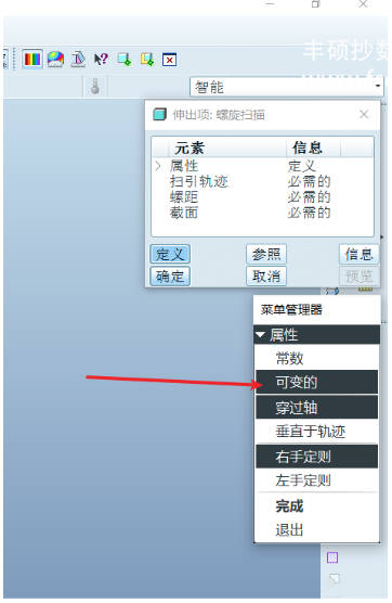 2,使用螺旋扫描-伸出项后,弹出的指令绘图界面如下,属性更改为可变的,按完成;
