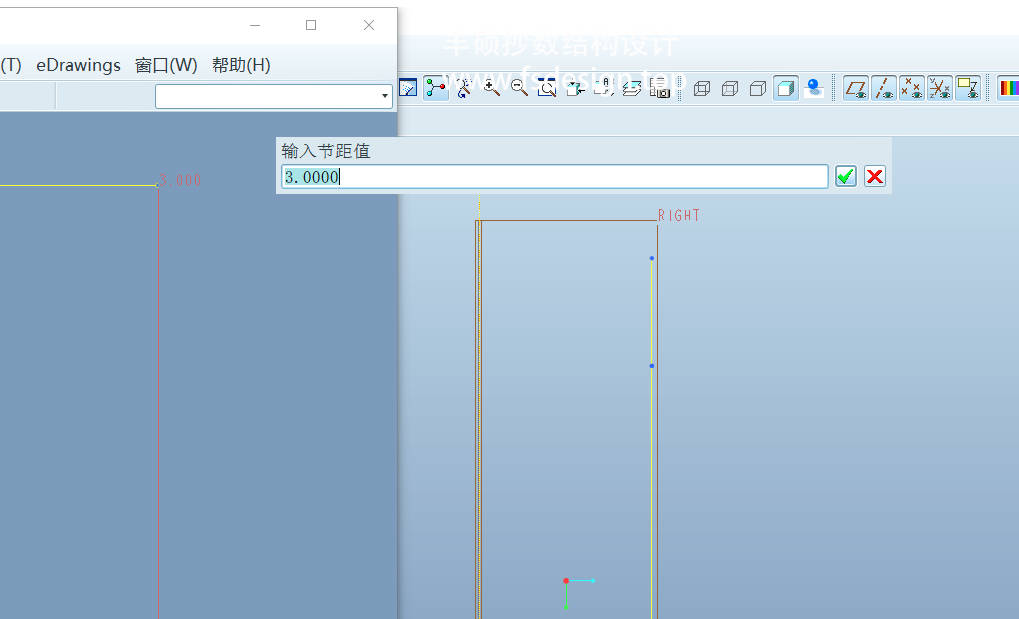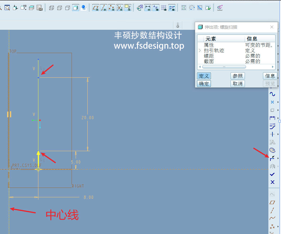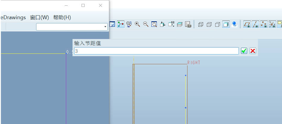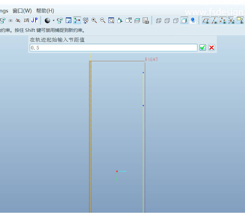 4,按软件的操作提示,进入到草图界面,绘制一中心线及一条竖直的线,由于我们要使用可变螺距,记得要在路径线上画断点,如图,在线上增加了两个断点;